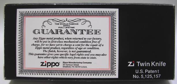 | 【ZIPPO Z-Twin Knife】 1997年発売。 全長約15cmの折りたたみ式スチール製ナイフ。ブレードを収めた時のサイズは8.9cm。 Cut-About Knifeと同様、ロックバック機構が付いている。 持ち手部分の先端には、キーリングが付いた着脱可能なピンが差し込まれている。 小売用カタログへの掲載は2001年までだが、ビジネスギフト用カタログには2004年まで掲載されていた。 |