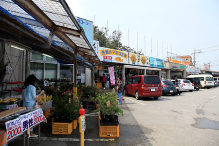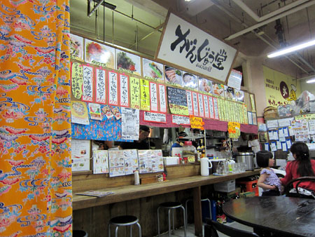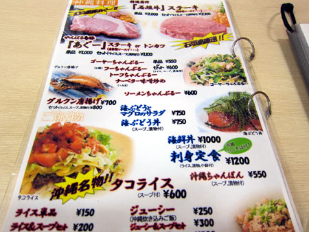 ![]() *公設市場の2階にある沖縄料理店(がんじゅう堂) *本場のゴーヤチャンプルー定食(\600)とソーキそば(\550)を食べました。 |