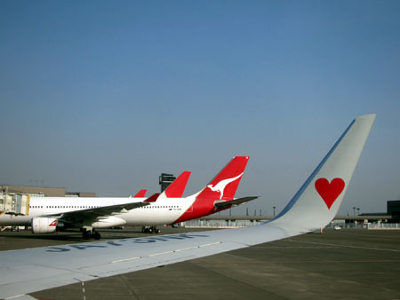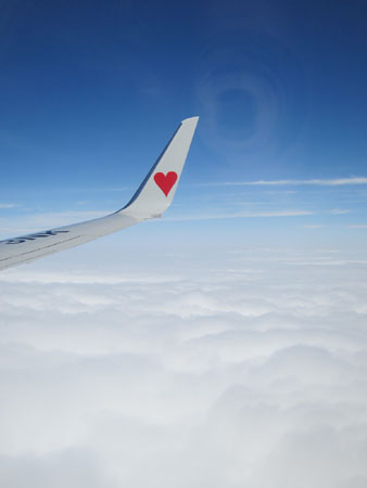 ![]() *成田空港から最新鋭のハイテク機ボーイングB737-800型機に搭乗 *主翼先端のハートマークが印象的です。 |