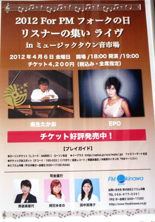 | 年間10回ほど開催される”来生たかお”さんのライブツアーを追って沖縄に行ってきました。今回はエフエム沖縄(FM放送)が主催する番組にエポさんと来生さんが |